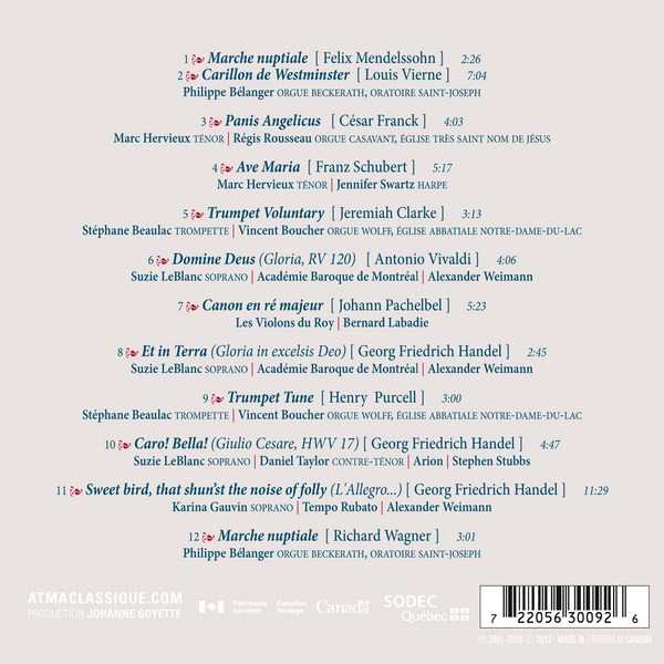 Listeners will also discover the dazzling voices of Marc Hervieux, Karina Gauvin, Suzie Leblanc, and Daniel Taylor singing classic airs which can enhance any wedding ceremony, or recall fond memories.