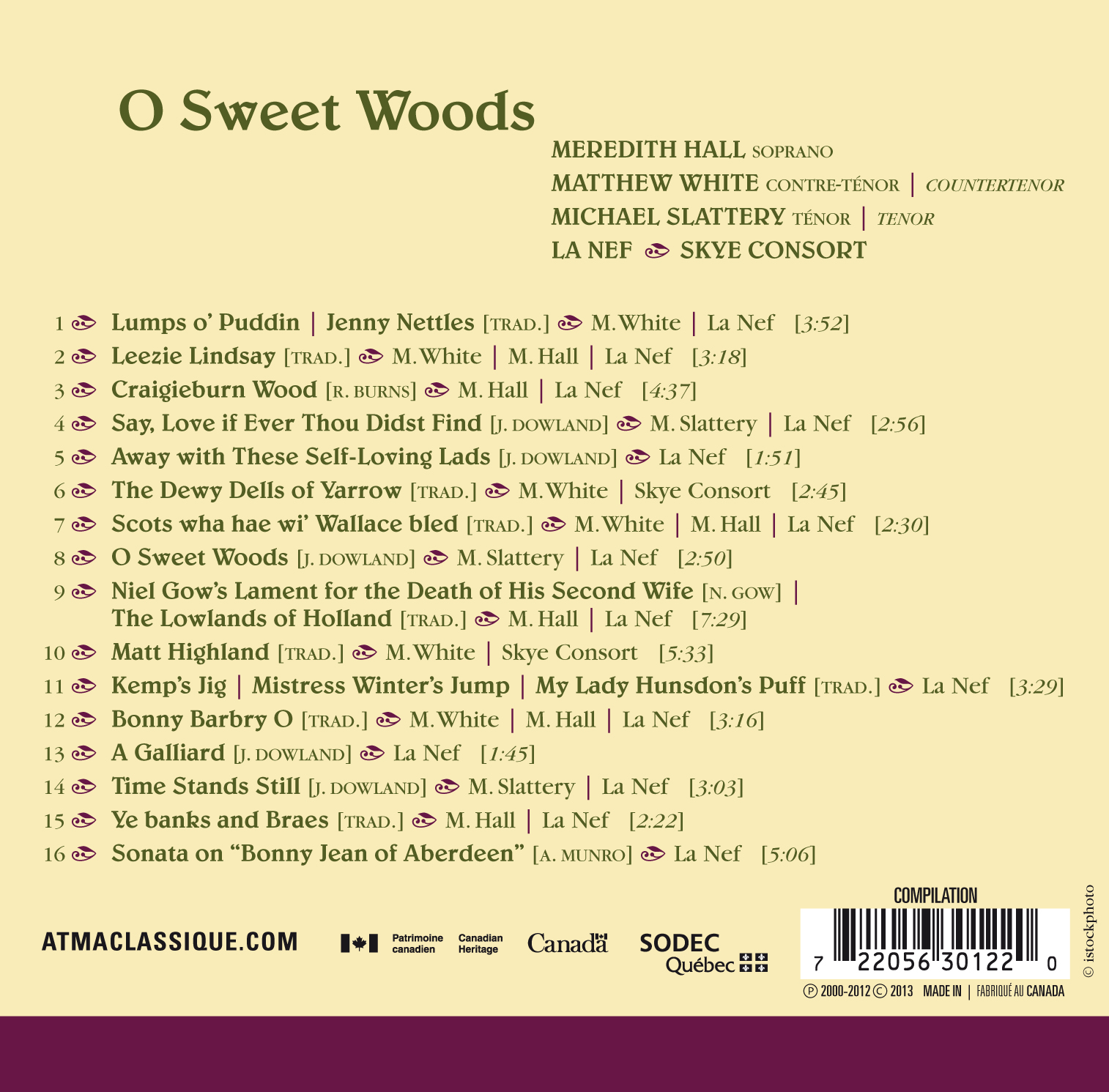 The Scottish and Irish airs and instrumental pieces chosen for this new sampler were selected from previous ATMA recordings by singers Meredith Hall, Matthew White, and Michael Slattery, along with ensembles La Nef and Skye Consort.